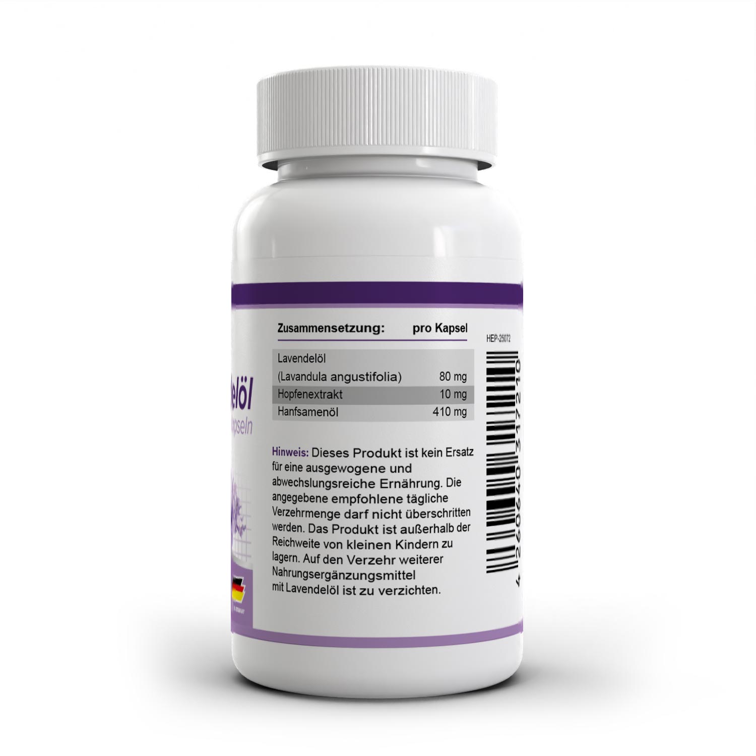 Raffiniertes Hanfsamenöl, Hydroxypropylmethylcellulose (Kapselhülle), Lavendelöl (Lavandula angustifolia), Hopfenextrakt