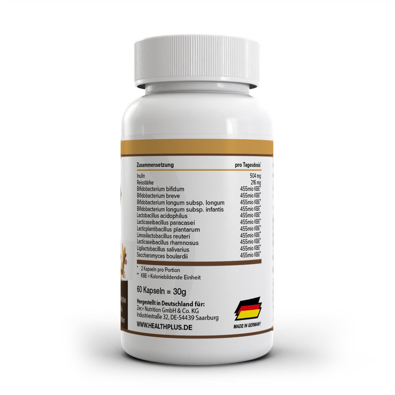 Inulin, Reisstärke, Überzugsmittel: Hydroxypropylmethylcellulose, lebende Bakterienkulturen: Bifidobacterium bifidum, Bifidobacterium breve, Bifidobacterium longum subsp. longum, Bifidobacterium longum subsp. infantis, Lactobacillus acidophilus, Lacticaselibacillus paracasei, Lactiplantibacillus plantarum, Limosilactobacillus reuteri, Lacticaselibacillus rhamnosus, Ligilactobacillus salivarius, Saccharomyces boulardii.