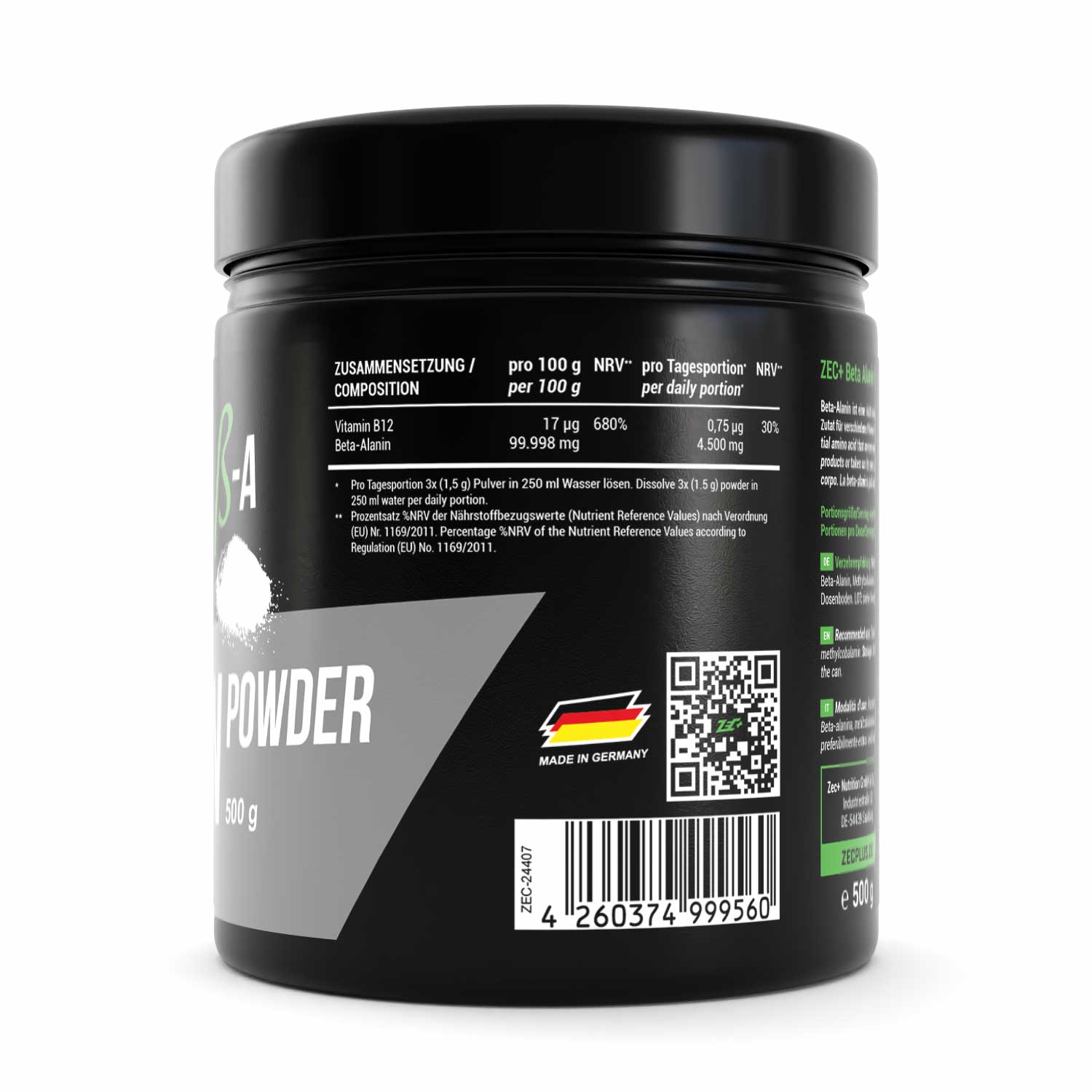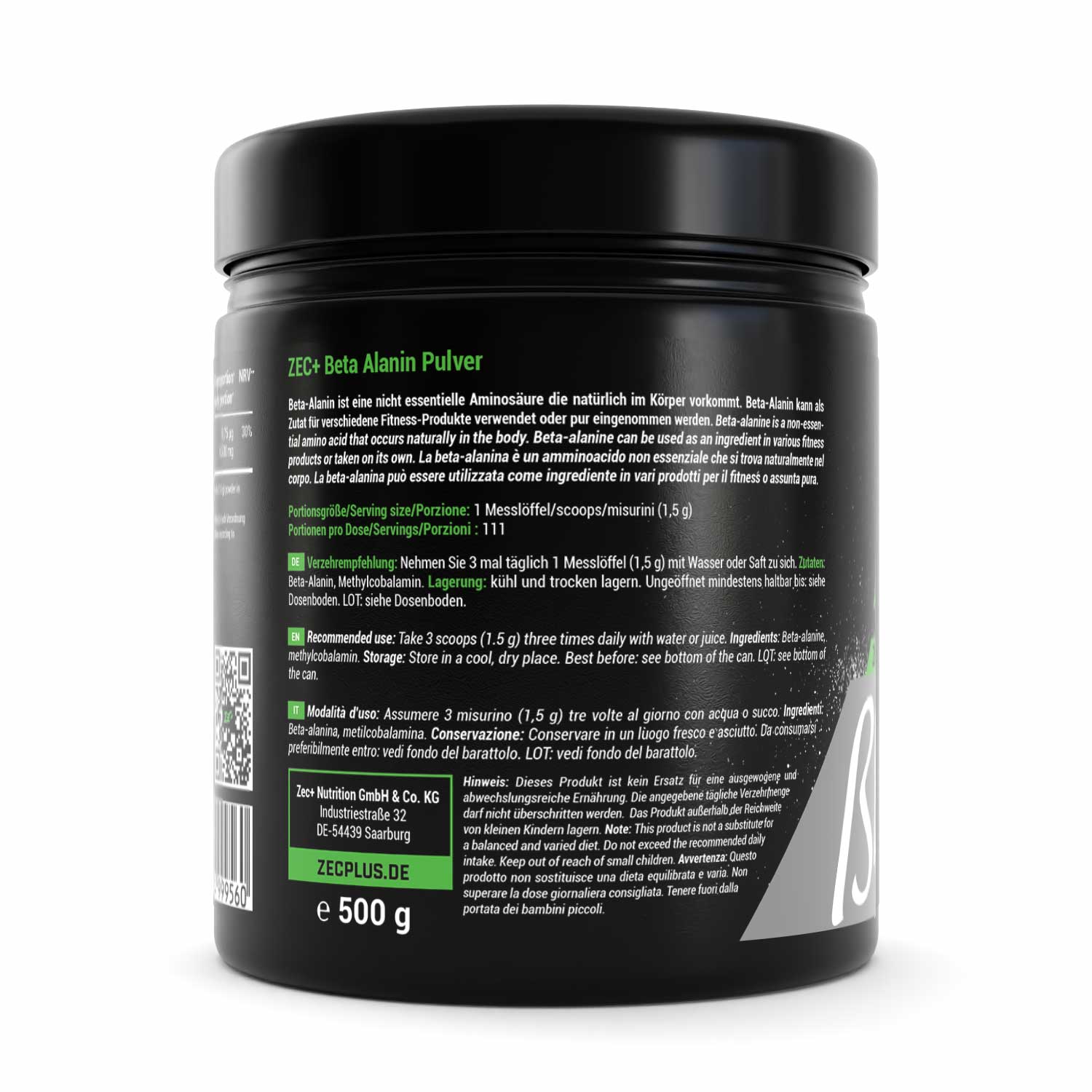 Der ZEC+ Beta Alanin Pulver-Drink ist ein vielseitiges Supplement für Workout, Bodybuilding und Fitness. Es ist ein wirkungsvolles und daher beliebtes Nahrungsergänzungsmittel beim Muskelaufbau und Krafttraining, da es nicht nur das Muskelwachstum, sondern auch den Erhalt der Muskeln bei regelmäßiger Einnahme positiv beeinflussen kann. Seine volle Wirkung entfaltet und die besten Resultate erzielt das Beta Alanin Pulver, wenn 1,5 g als Shake 3-mal täglich über mindestens 2 Wochen eingenommen werden. Es zeigt seine Wirkung auch bei der einzelnen Einnahme von 3 g vor dem Training, allerdings ist eine Dauereinnahme effektiver.
